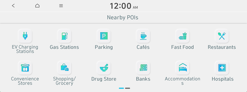 - On the Navigation Menu screen, press Nearby POIs ▶ EV Charging Stations.