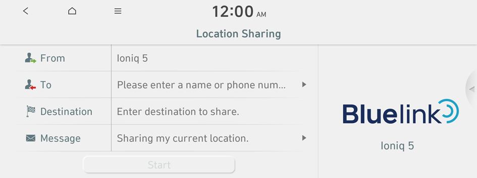 You can share the current location of the vehicle and the destination with others. You can select up to 15 recipients to share the location with by searching contacts on your mobile phone via Bluetooth or by manually entering the phone numbers.