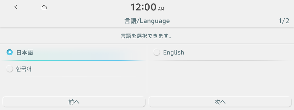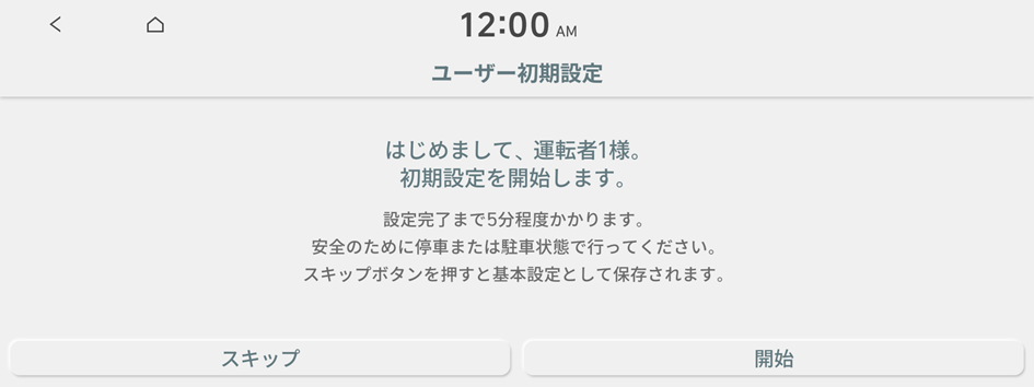 ユーザー初期設定画面では、画面に表示される運転者名や言語、地図表示方式を設定できます。