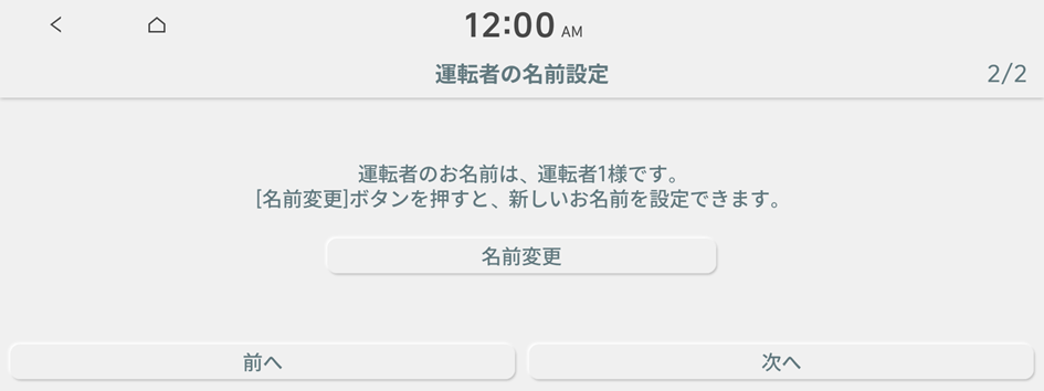 - 運転者の名前を変更せずにユーザー初期設定を続行するには、次へを押してください。