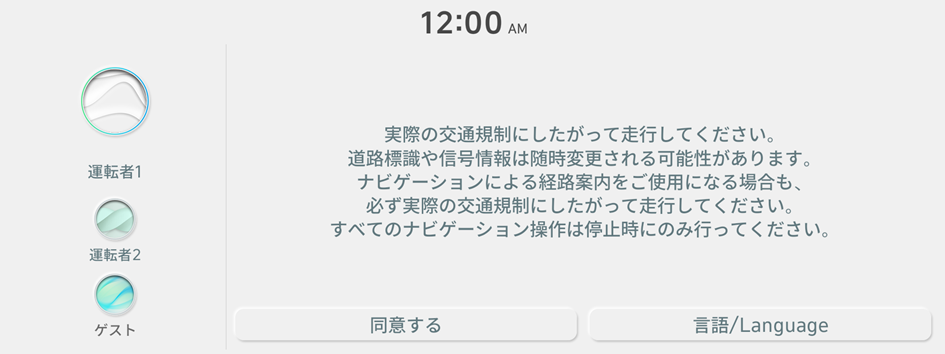 - 表示された安全警告メッセージをお読みになり、設定したい運転者を選択し、同意するを押します。