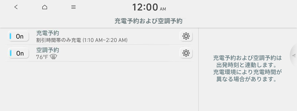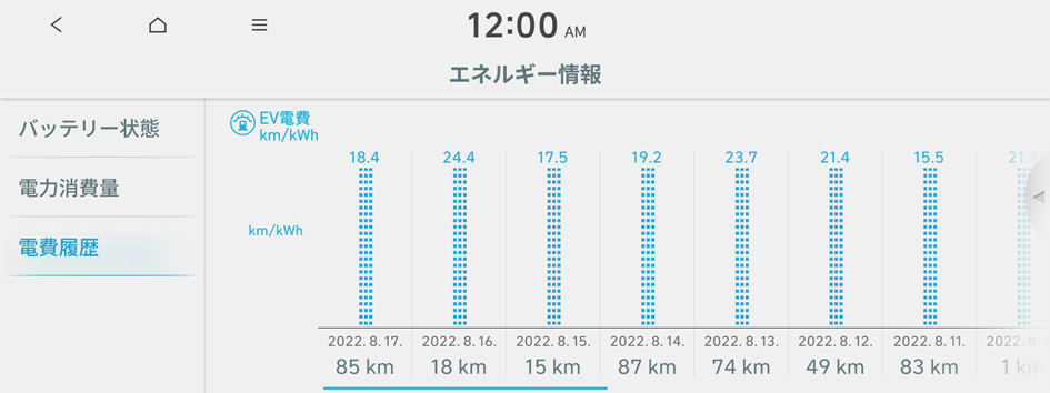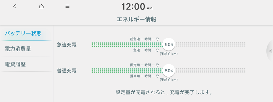 走行可能距離、充電完了までの予想時間、電費グラフ、消費電力などを確認できます。