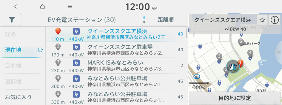 走行可能距離を超えて移動する場合、走行可能距離範囲内の充電ステーションを検索後に経路案内機能をご使用になれます。