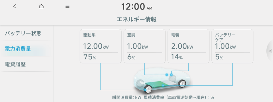 駆動系、空調、電装、バッテリーケア機能の消費電力が表示されます。