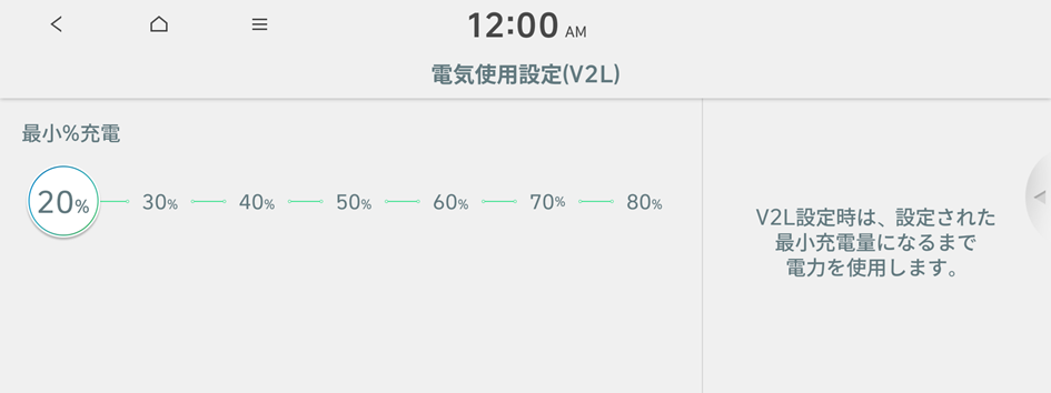 ユーティリティモードを設定できます。この機能をオンにすると、車両の駆動用(高電圧)バッテリーを使用して車室内の電気製品を作動します。