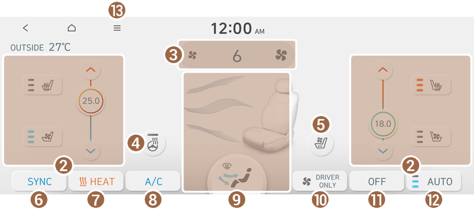 - 運転席と助手席の温度を同期する機能のオンとオフを切替えます。(装備されている場合)