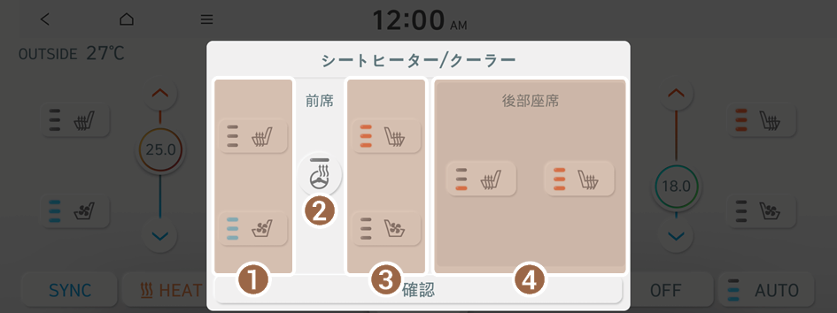 - 前席と後部座席のシートヒーター/クーラーを設定するポップアップウィンドウを表示します。