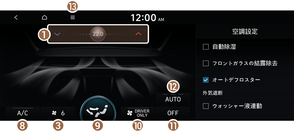 - 運転席の空調機能のオンとオフを切替えます。