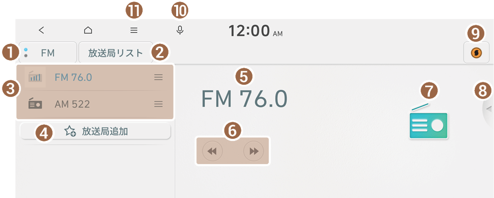 ラジオ画面では、ラジオを聴く際のさまざまな機能を提供しています。