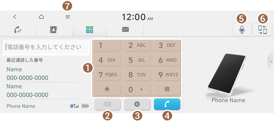 Bluetoothでスマートフォンとシステムを接続すると、スマートフォンに触れることなく、システム画面から電話番号を入力して発信できます。車両にはマイクとスピーカーが内蔵されているため、スマートフォンを安全かつ簡単に使用することができます。