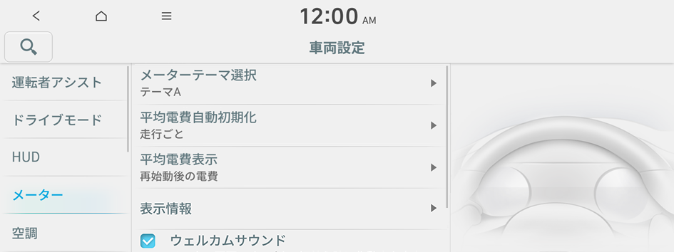 車両の走行および車内外の環境に関する機能を設定できます。