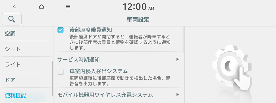 ウェルカムサウンドやワイヤレス充電など、便利な機能を設定できます。