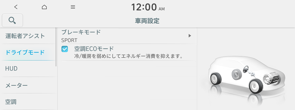 電費効率を高めるドライブモードです。空調システム制御モード、回生ブレーキのエネルギーレベル、速度制限設定(装備されている場合)を変更します。