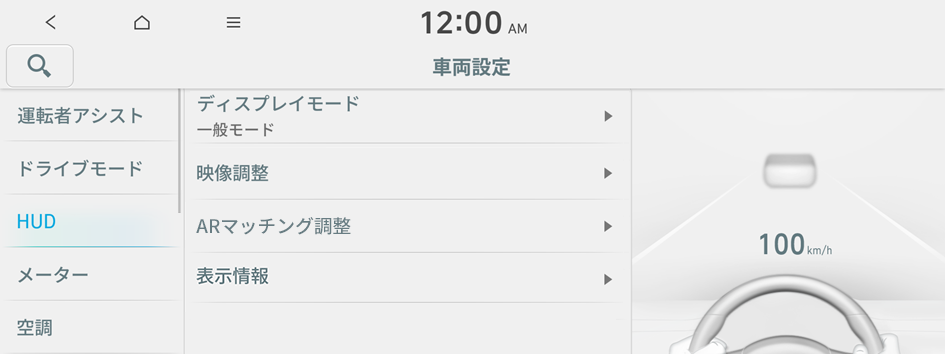 走行速度や道路情報などの情報を表示するヘッドアップディスプレイ機能を設定できます。