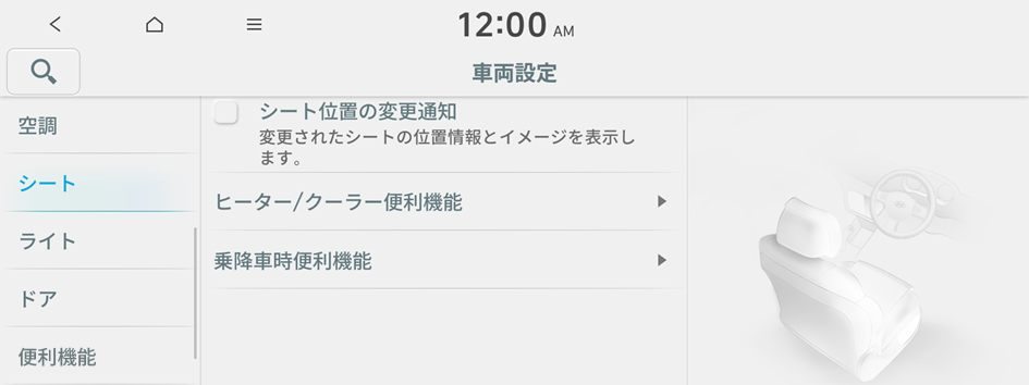 シートやステアリングに関するさまざまな機能を設定できます。