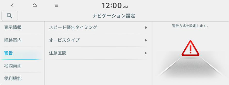 ナビゲーション設定画面では、画面表示、音声案内などナビゲーションの設定ができます。登録地点や目的地履歴の読込みと書出しができます。