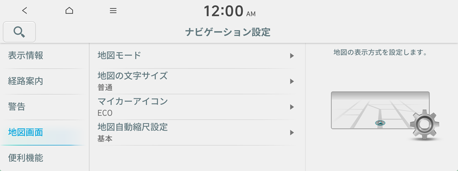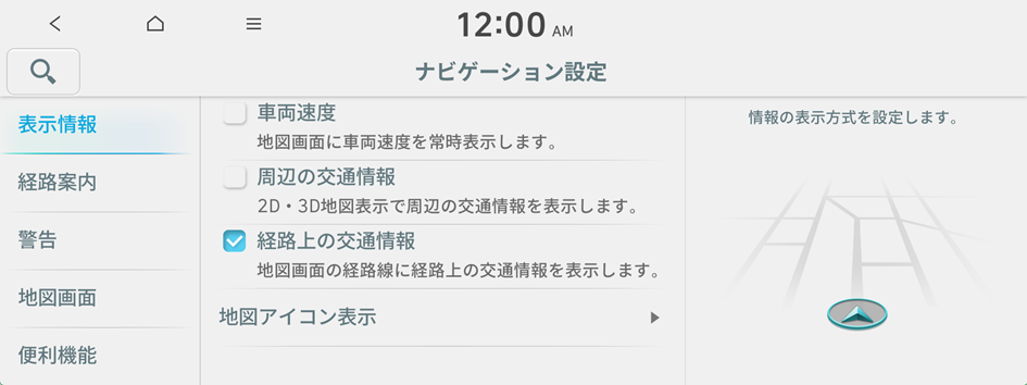 を押してキーワードを入力すると、設定項目を検索できます。音声でも設定項目を検索できます。ナビゲーションの地図画面に表示する情報を設定します。