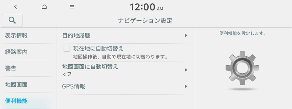 地図操作時の便利機能設定やGPS情報の確認など、ナビゲーションをより便利にご使用になるための機能を設定します。