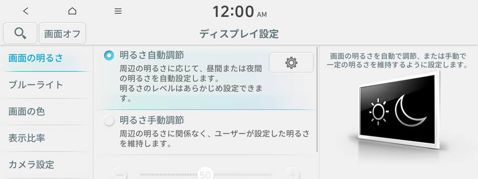 周囲の明るさに応じて昼間または夜間の画面の明るさを自動で調節するように設定します。昼間または夜間の画面の明るさのレベルを設定するには、