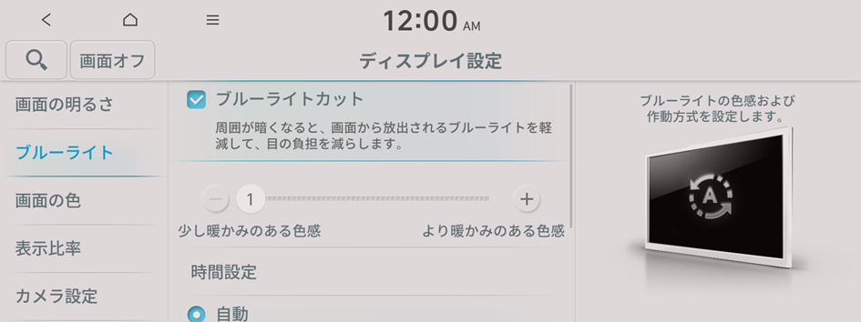周辺の明るさに応じて自動でブルーライトフィルタ機能が実行するように設定したり、ブルーライトフィルタ機能を使用する時間帯を設定します。