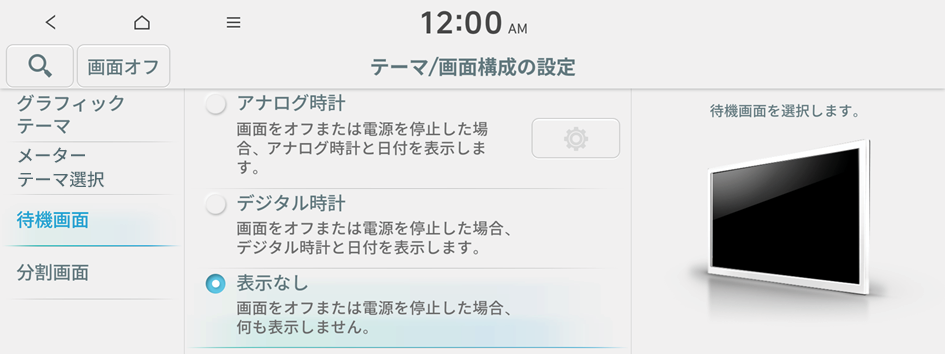 画面またはシステムをオフにすると、アナログ時計と日付を表示します。