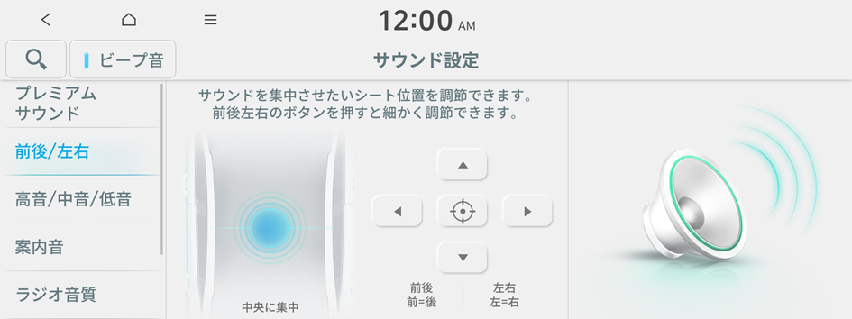 サウンドを集中させたい座席の位置を調整します。微調整するには、前後左右の