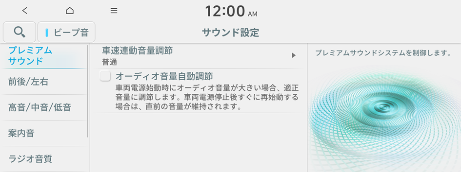 を押してキーワードを入力すると、設定項目を検索できます。音声でも設定項目を検索できます。プレミアムサウンドシステムを制御します。