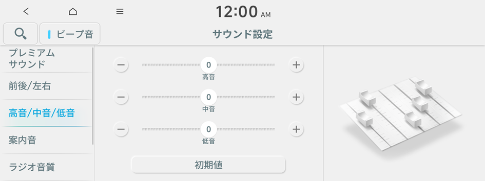 低音、中音、高音の各音域の強さ(出力レベル)を調節して、特定の音域の音をより強くまたは弱く出力するなどの設定をします。