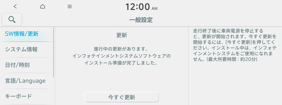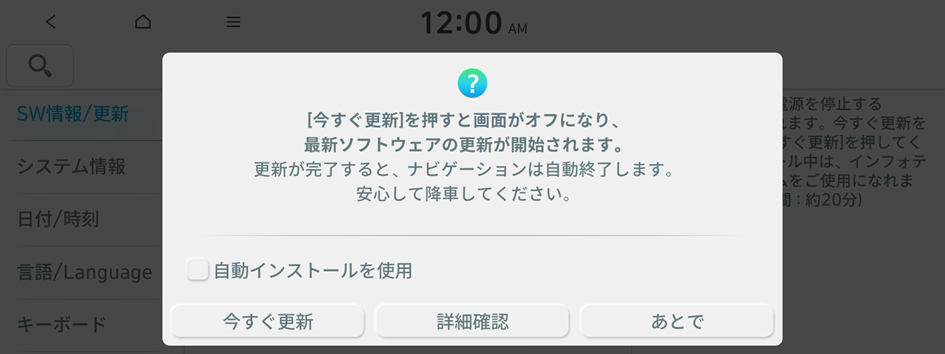 車両電源を停止後に表示される更新通知ポップアップを使用して、ナビゲーション地図とインフォテインメントシステムを更新できます。