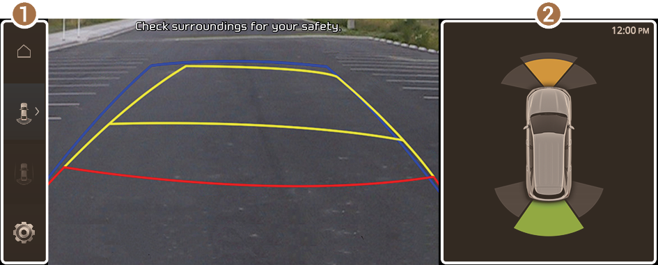 The distance shown in the rear view screen may differ from the actual distance. For safety, be sure to visually check the rear, left, and right sides of your vehicle.