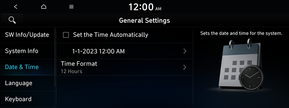 You can set the system date and time automatically or manually. You can also set the time display mode.