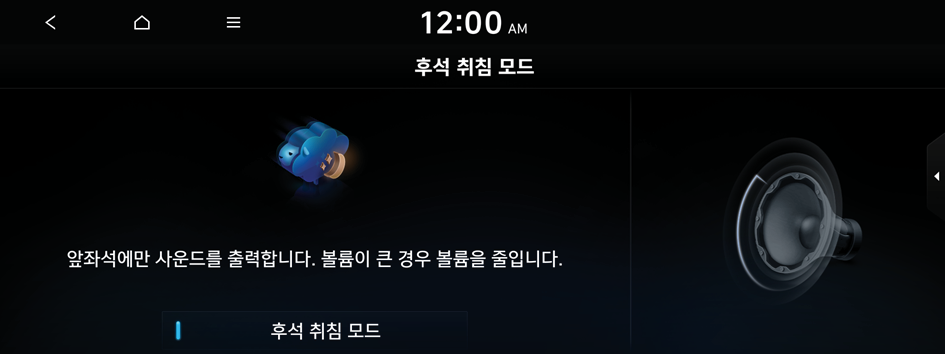 뒷좌석의 오디오가 음소거 됩니다. 또한 앞좌석의 음량이 크게 설정되어 있는 경우 자동으로 음량이 줄어듭니다.