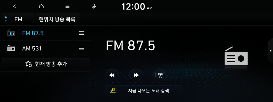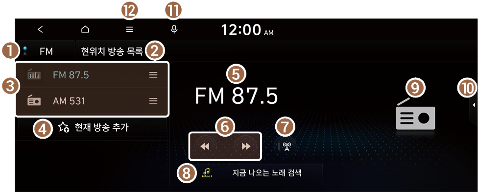 라디오 화면은 방송 청취 중에 실행할 수 있는 다양한 기능들로 구성되어 있습니다.