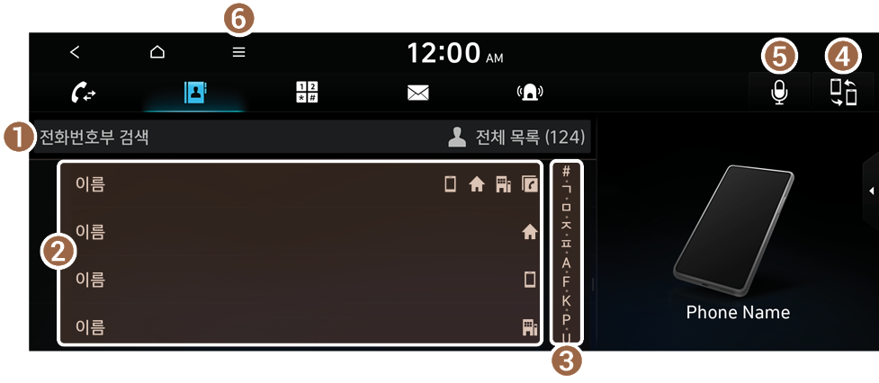 연결된 휴대 전화에 저장된 연락처를 시스템에서 사용할 수 있습니다.