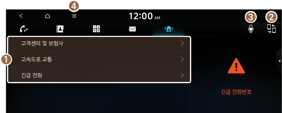 고객센터 및 보험사, 고속도로 콜센터 등 시스템에 등록된 긴급 전화 목록을 사용해 전화를 걸 수 있습니다.