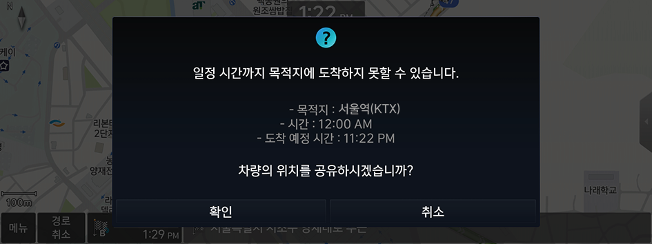 경로 탐색 시 도착 예정시간이 캘린더 일정의 시간 정보보다 늦을 경우, 팝업창으로 알림 및 위치 공유 기능을 제공합니다.