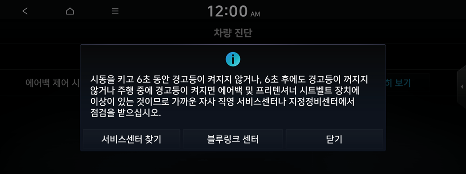 계기판에 엔진이나 변속 시스템 경고등이 켜지면 차량의 상태를 원격으로 진단받을 수 있습니다. 차량 정보가 현대자동차 고객센터로 전송되면 상담원을 통해 진단 결과를 안내받고 견인, 정비소 길 안내, 정비 예약 등의 추가 서비스를 이용할 수 있습니다.