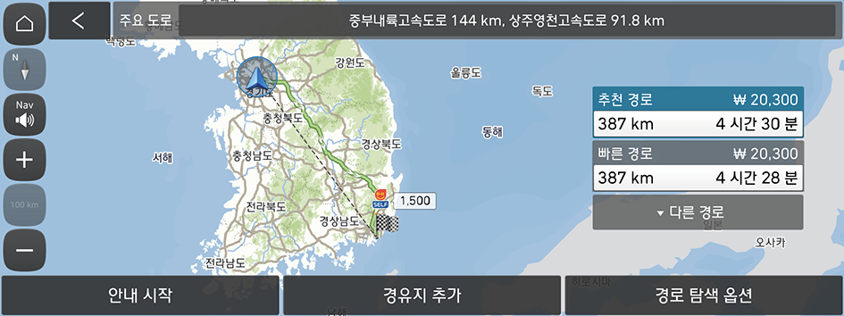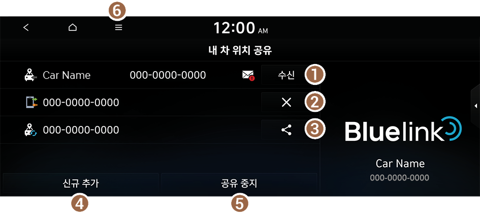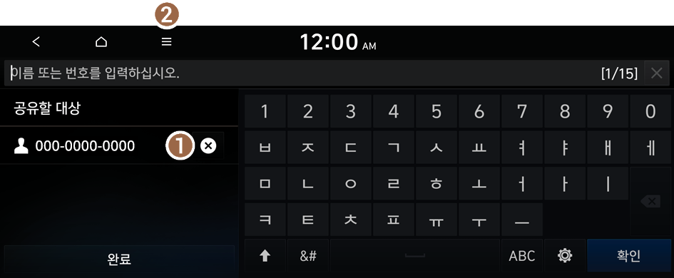 내 차의 현재 위치와 목적지를 원하는 사람에게 공유할 수 있습니다. 블루투스로 연결된 휴대 전화의 연락처를 검색하거나 전화번호를 직접 입력해 위치를 공유받을 사람을 최대 15명까지 선택할 수 있습니다.