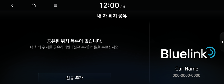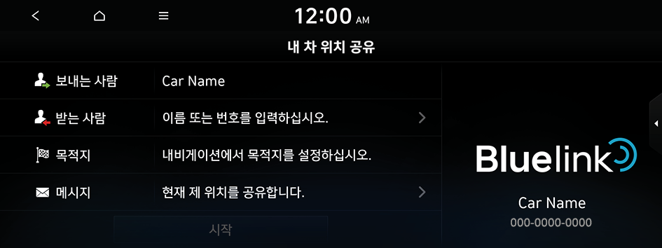 시스템 화면에 위치 공유 아이콘이 표시되며, 내 차의 현재 위치를 확인할 수 있는 URL 주소가 상대방에게 문자 메시지로 전송됩니다.