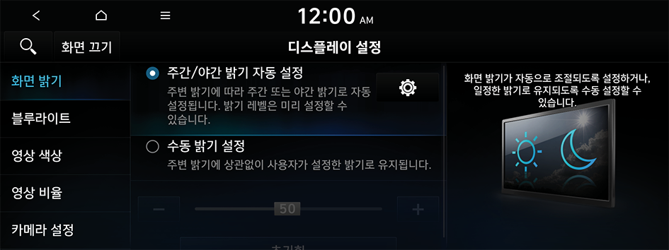 주변 밝기에 따라 시스템의 화면 밝기가 자동으로 조절되도록 설정합니다. 주간 또는 야간의 화면 밝기 수준을 설정하려면