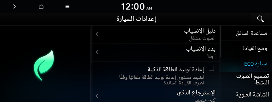 يمكنك زيادة مستوى الاقتصاد في استهلاك الوقود بوضع القيادة هذا. يمكنك تغيير إعدادات عناصر التحكم في المناخ ومستوى طاقة الكبح الذاتي وحدود السرعة.