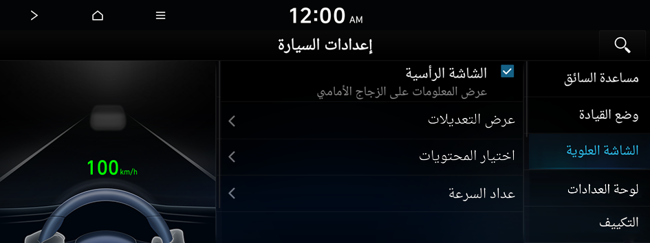 يمكنك التعيين لاستخدام الشاشة العلوية التي تعرض المعلومات مثل سرعة القيادة والمعلومات المتعلقة بالطريق أثناء القيادة.