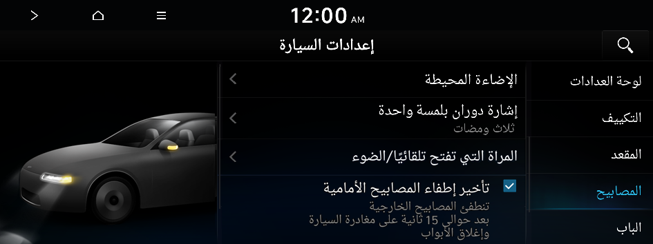 يمكنك التعيين لإطفاء الأضواء الخلفية والأمامية في غضون 15 ثانية بعد إيقاف تشغيل السيارة لوضوح الرؤية.