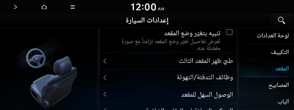 يمكنك التعيين لاستخدام الميزات المتنوعة (التحكم في القيادة والتحكم في تدفئة مقعد السائق والمقعد الخلفي وعجلة القيادة) المتعلقة بالمقاعد وعجلة القيادة.