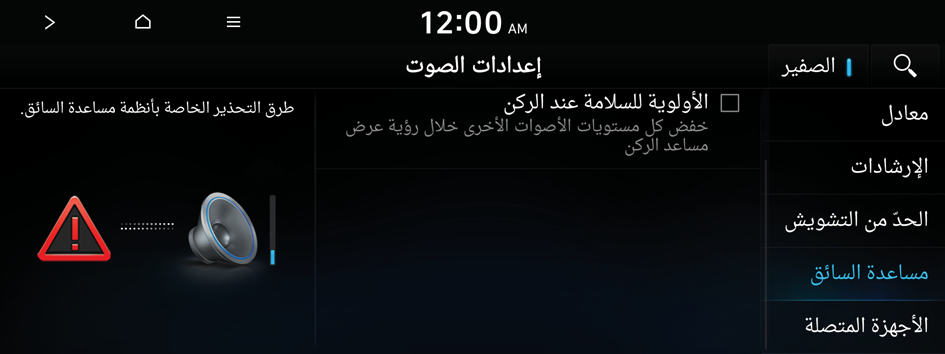 يمكنك الضبط لإعطاء الأولوية لميزة التحذير بشأن الاقتراب وتخفيض جميع الأصوات الأخرى عند ركن سيارتك.