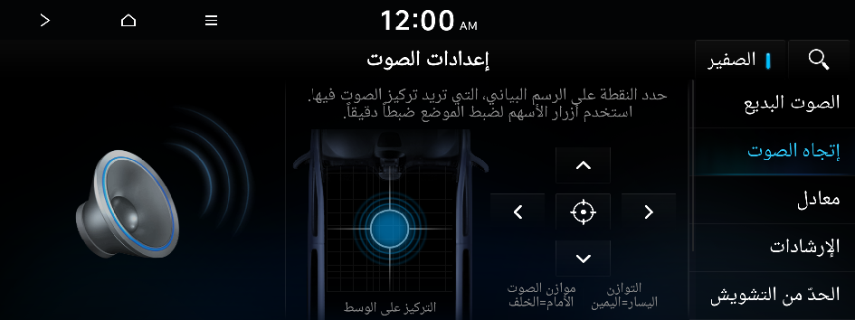 يمكنك تحديد موضع حيث يكون الصوت مسموعًا بصورة أكبر في السيارة. ويمكنك ضبط الموضع بدقة من خلال الضغط على النقطة المطلوبة على صورة المقعد أو الضغط على أزرار الأسهم. اضغط على