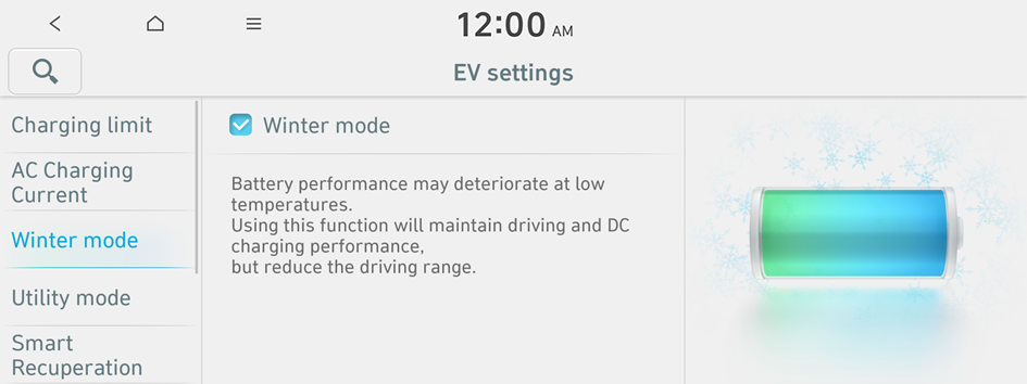 Battery mode optimised for maintaining driving performance and shortening DC charging time when driving in winter.