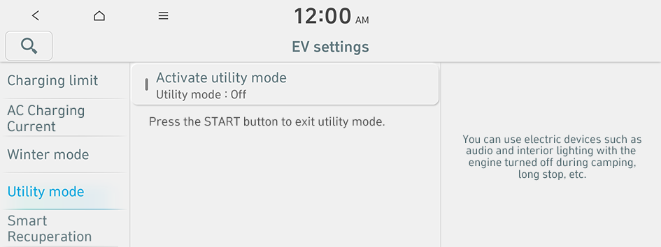 Turns on utility mode. When this function is on, electric systems on the vehicle are operated using the driving (high-voltage) battery.