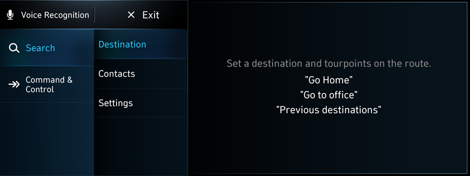 Navigation commands | Run navigation, and set a destination or waypoints. | Find <POI> Go Home/Go to Office Recalculate |