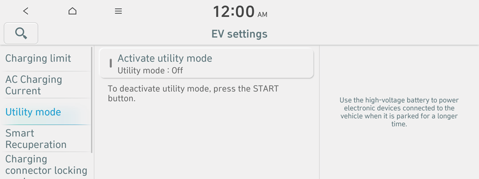 Turns on utility mode. When this function is on, electric systems on the vehicle are operated using the driving (high-voltage) battery.